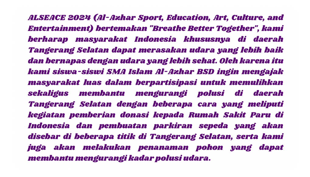 ALSEACE 2024 (Al-Azhar Sport, Education, Art, Culture, and Entertainment) bertemakan "Breathe Better Together", kami berharap masyarakat Indonesia khususnya di daerah Tangerang Selatan dapat merasakan udara yang lebih baik dan bernapas dengan udara yang lebih sehat. Oleh karena itu kami siswa-siswi SMA Islam Al-Azhar BSD ingin mengajak masyarakat luas dalam berpartisipasi untuk memulihkan sekaligus membantu mengurangi polusi di daerah Tangerang Selatan dengan beberapa cara yang meliputi kegiatan pemberian donasi kepada Rumah Sakit Paru di Indonesia dan pembuatan parkiran sepeda yang akan disebar di beberapa titik di Tangerang Selatan, serta kami juga akan melakukan penanaman pohon yang dapat membantu mengurangi kadar polusi udara.